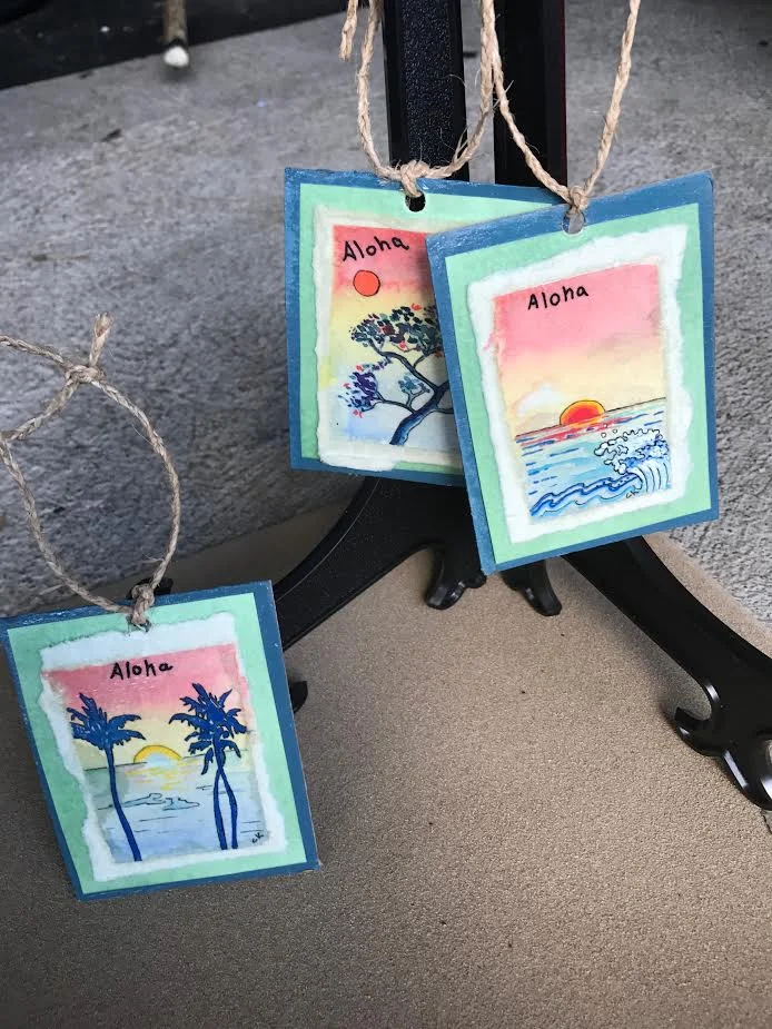 makes a very pretty and effective glaze for these Hawaiian themed ornaments featuring mini watercolor paintings and handmade Hau (native Hawaiian Hibiscus tree) rope.