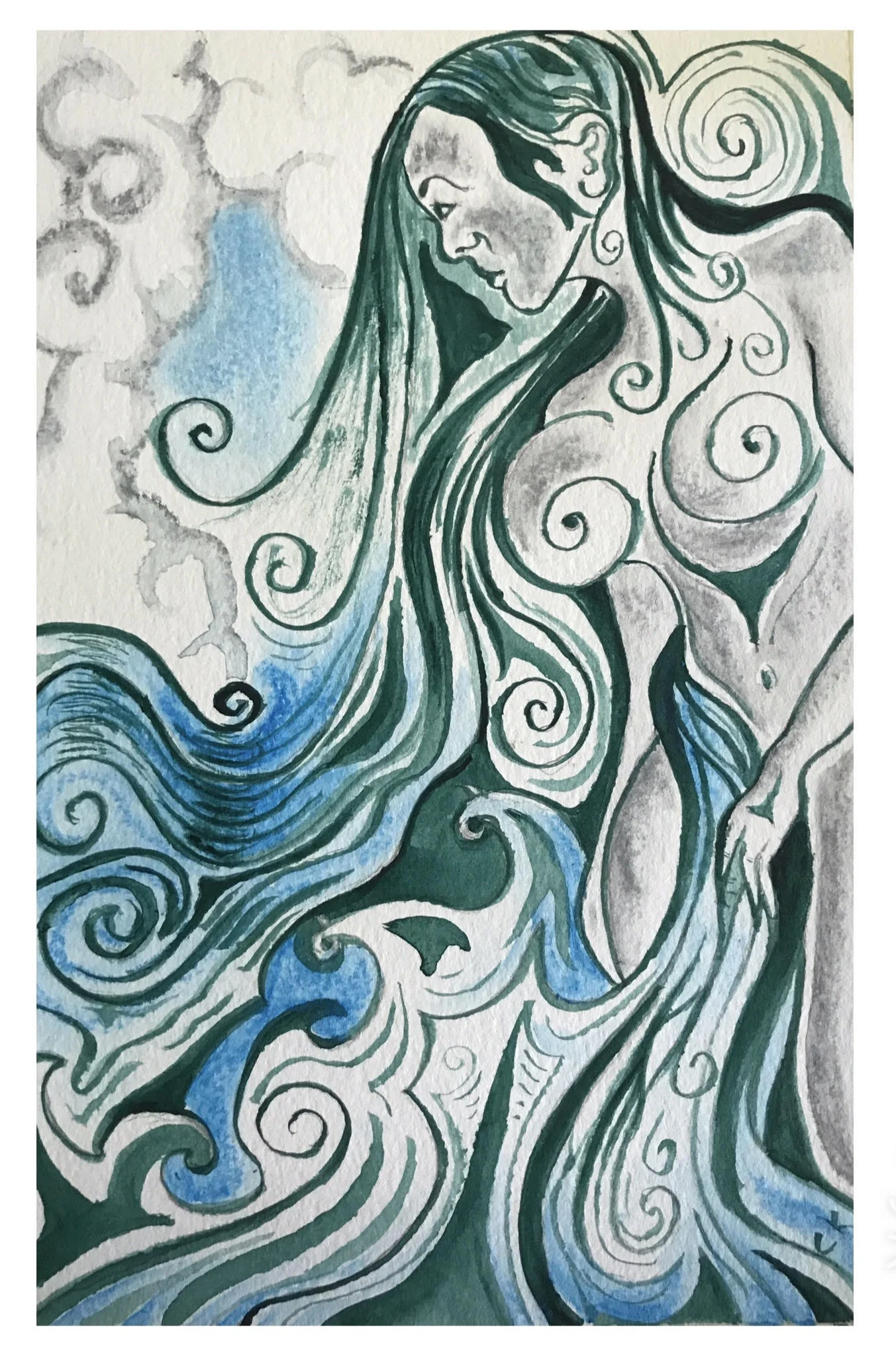The Hawaiian Goddess of the sea is portrayed using watercolor crayons and Heavy Body Muted Green acrylic paint. I painted her using only the Prima White Gold long liner brush.