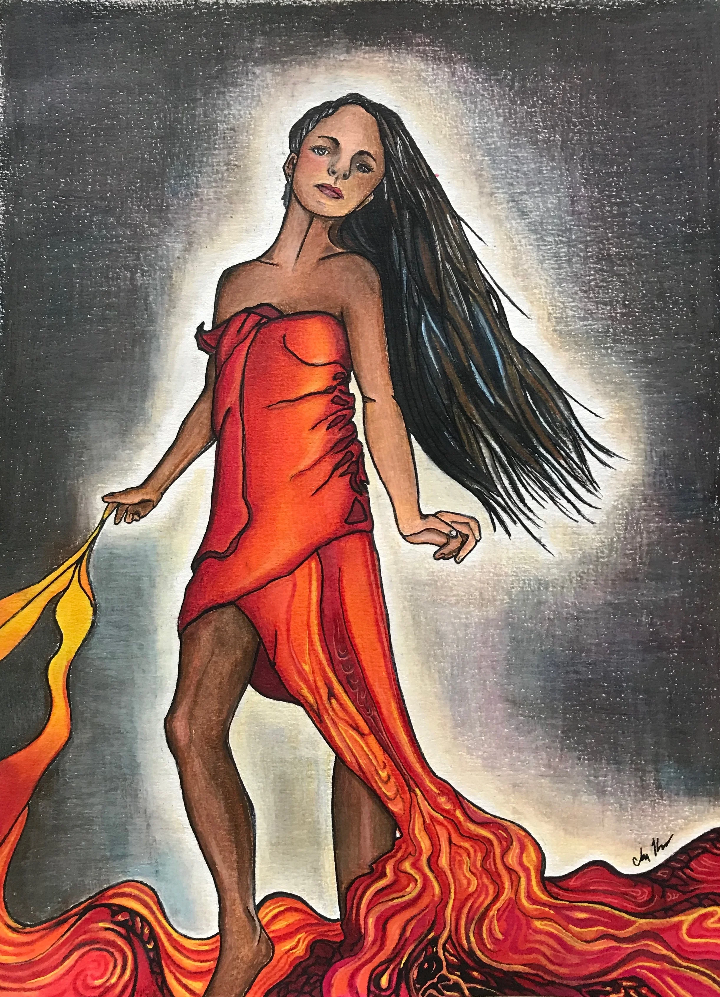 the Hawai'ian volcano goddess rises from the lava. (mixed media on art paper)